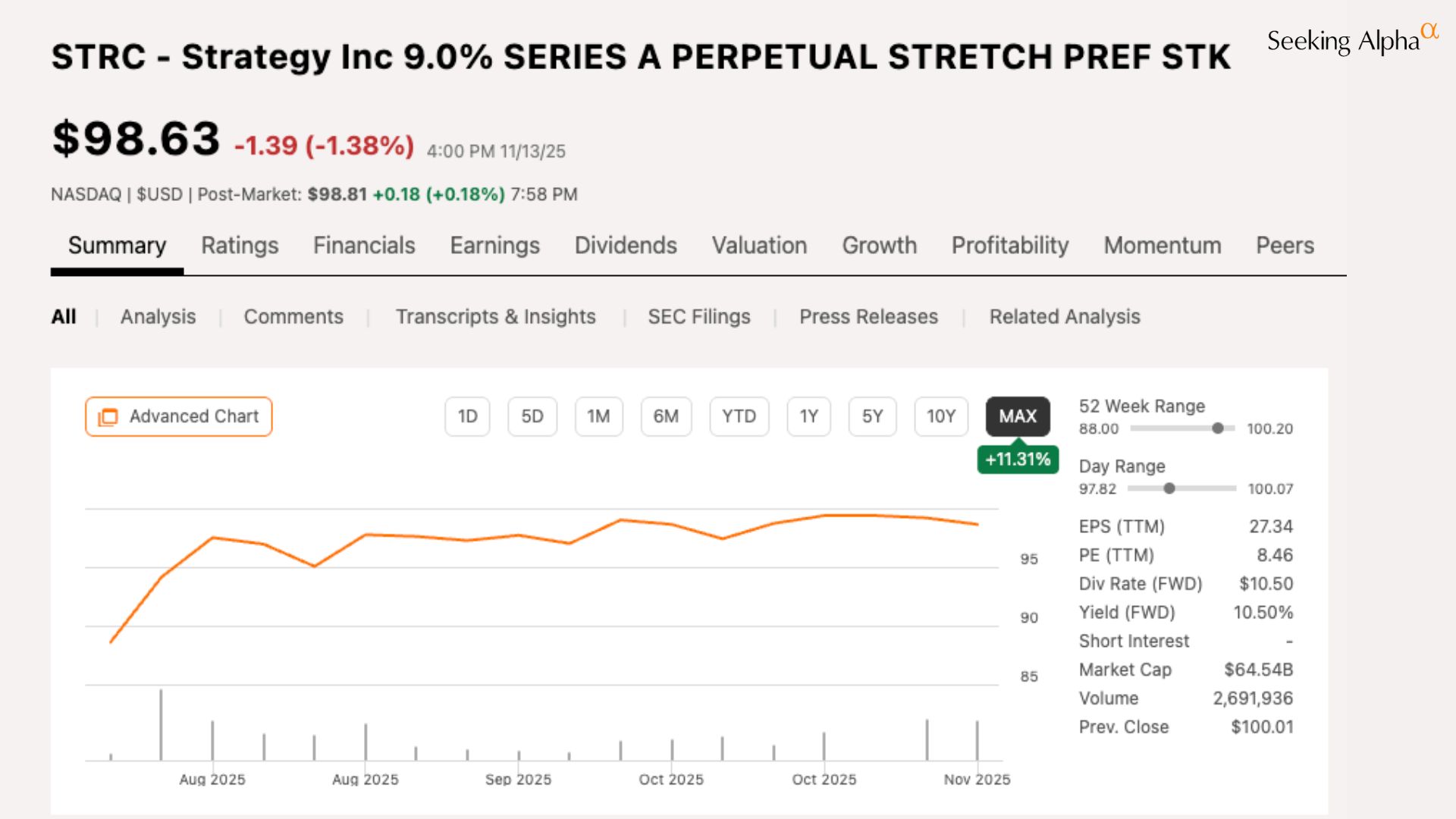 STRC — Strategy’s 9.0% Series A Perpetual Stretch Preferred — currently yields about 10.6%, pays monthly, and is specifically engineered for low volatility. The goal isn’t capital appreciation. The goal is price stability around $100.
