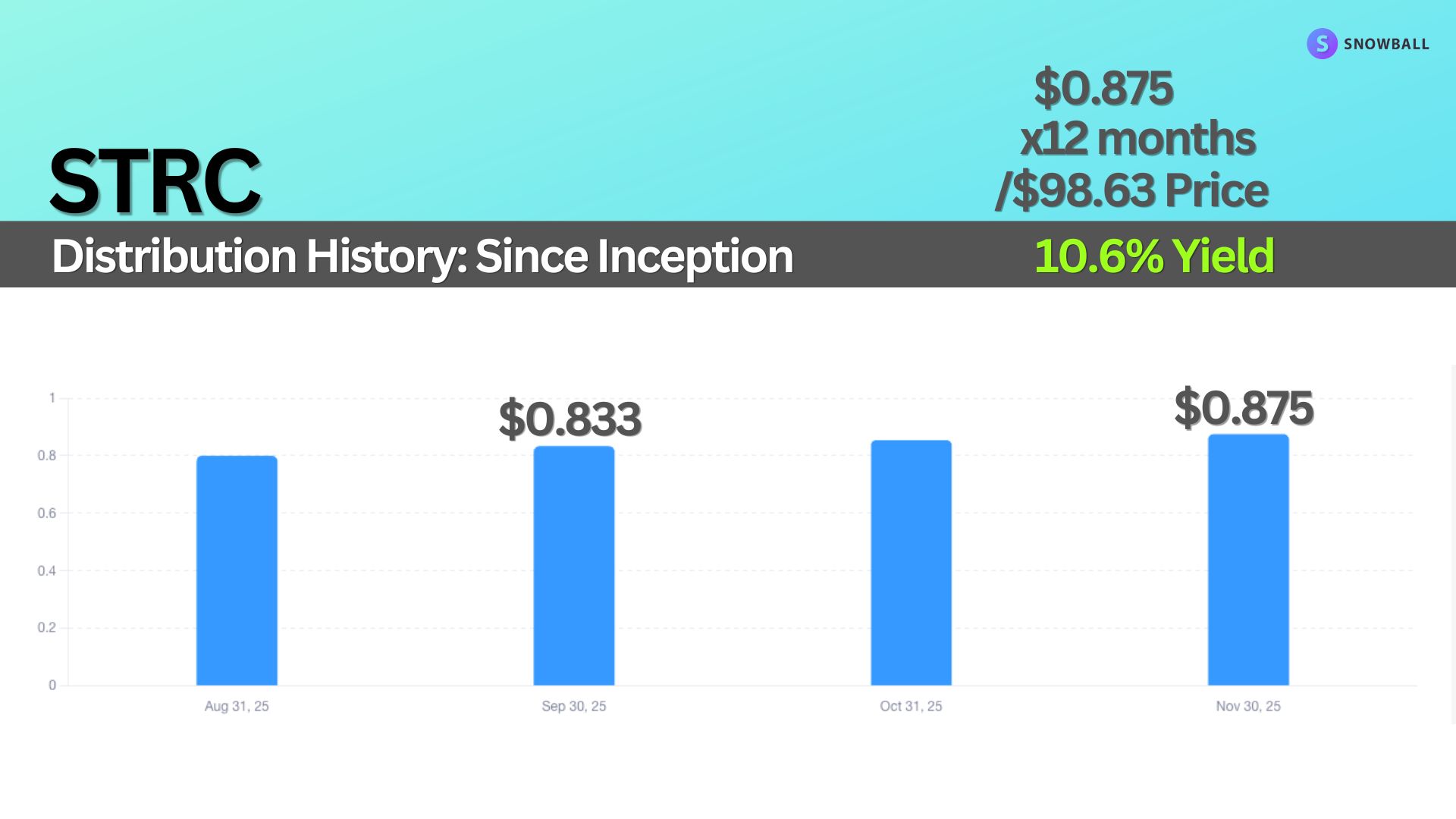STRC launched in July 2025, so the history is short. We can ignore the first payment because it covered a partial month. Since then, monthly distributions have ranged from $0.83 to $0.88.