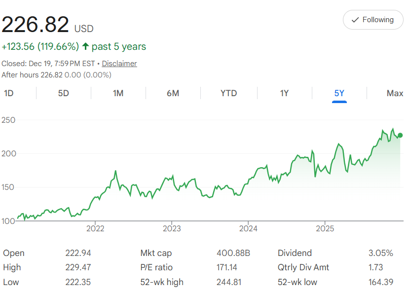 Five years ago, AbbVie Inc. $ABBV shares were trading around $103.26 each. Today, December 19, 2025, it's closed at $226.82—a solid 119.66% price gain that comes from its strong lineup of drugs like Humira for arthritis, Skyrizi for psoriasis, and Rinvoq for immune conditions, plus growing oncology and neuroscience portfolios. The chart shows a reliable upward path from 2022 lows, with consistent progress through 2025, and a 52-week high of $244.81 indicating more room for treatment-driven growth.In basic terms, the compound annual growth rate (CAGR) is 17.04%. That's the average yearly lift that explains the rise—calculated by raising the total growth factor to the 1/5 power and subtracting 1. Simply put, it's like adding about 17% to your money each year, on average.