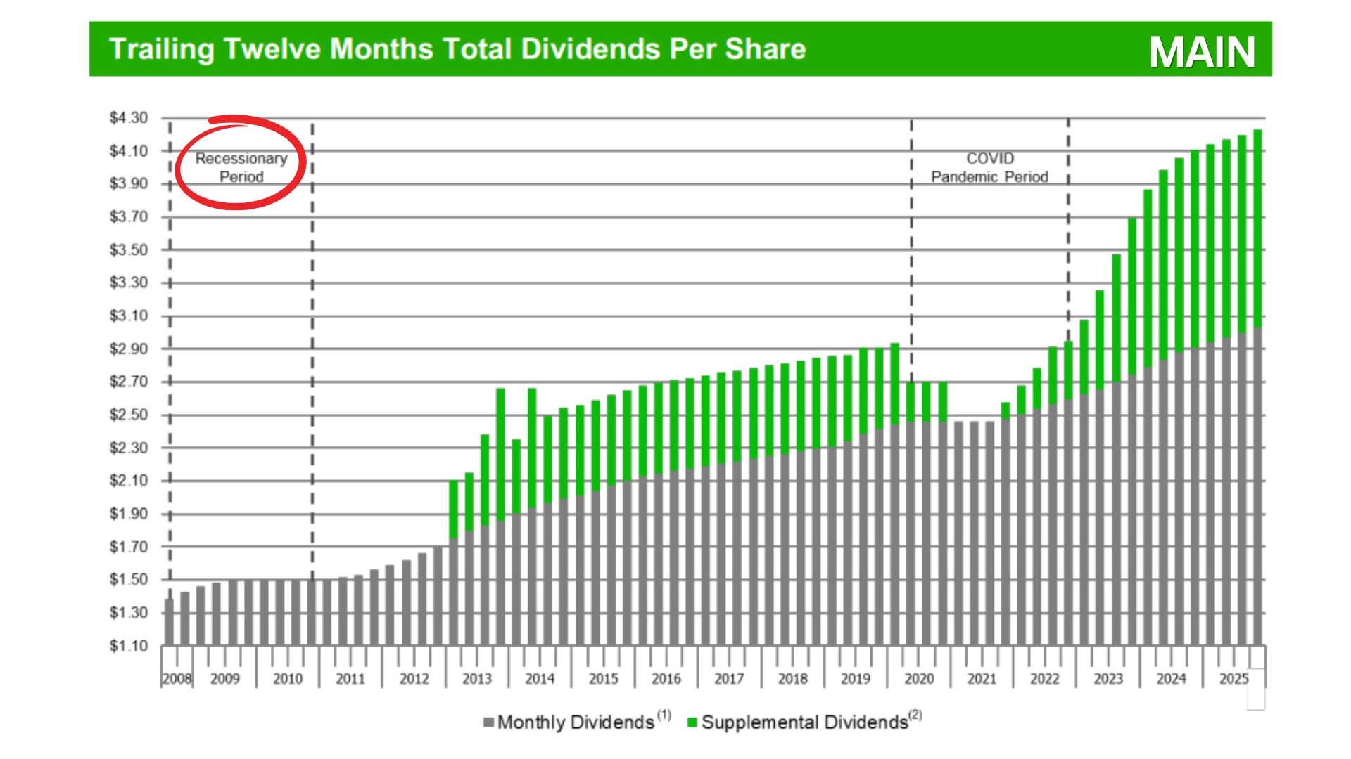 MAIN did not cut its regular dividend during 2008. Not once. And since 2007, the dividend has steadily increased.