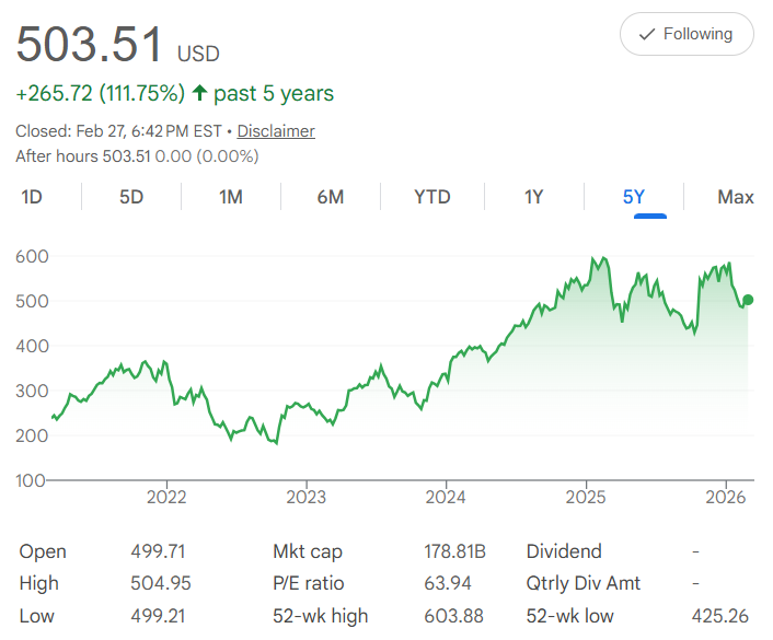Picture this: Five years ago, Intuitive Surgical $ISRG stock sat around $238 per share. Today in late February 2026, it closes at $503.51 for a clear +112% rise. The chart shows a steady climb with a few pauses, powered by growing use of advanced medical tools in hospitals worldwide. The 52-week high reached $603.88, showing the stock can push much higher in strong periods.