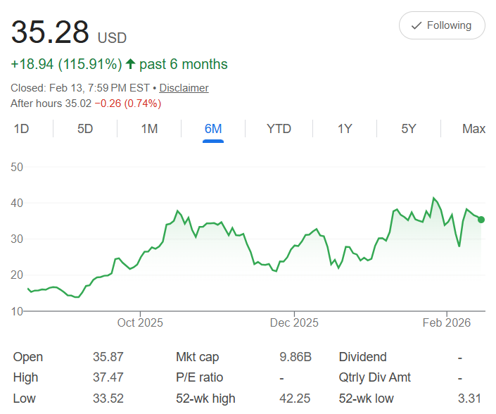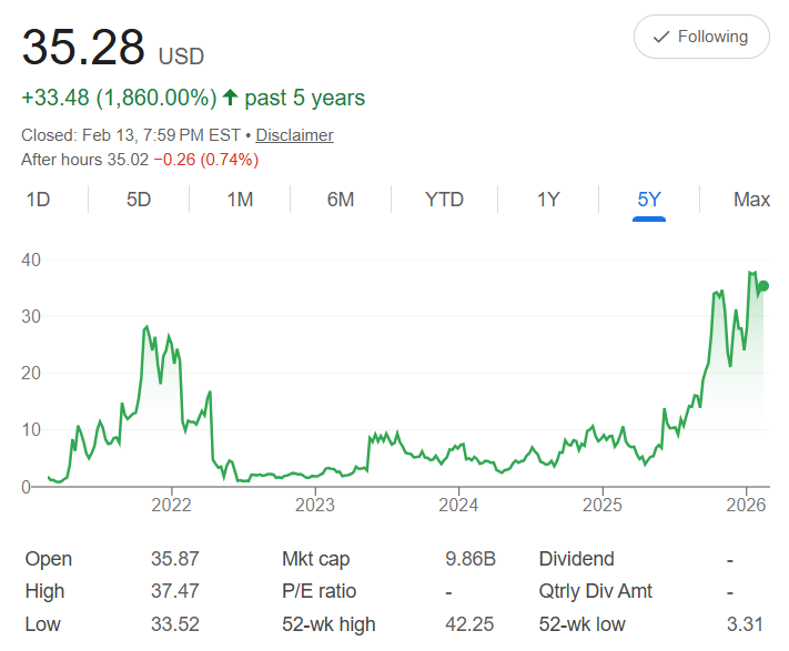 Five years ago, Applied Digital Corporation $APLD shares were trading around $1.80 each. Today, it's closed at $35.28—a huge 1,860% jump that comes from its growth in data centers, high-performance computing, and AI infrastructure, riding demand for cloud and digital services. The chart shows a long flat period through 2023, then steady gains in 2024 and a sharp rise in 2025, with after-hours at $35.02. That 52-week high of $42.25 marks the recent top strength.