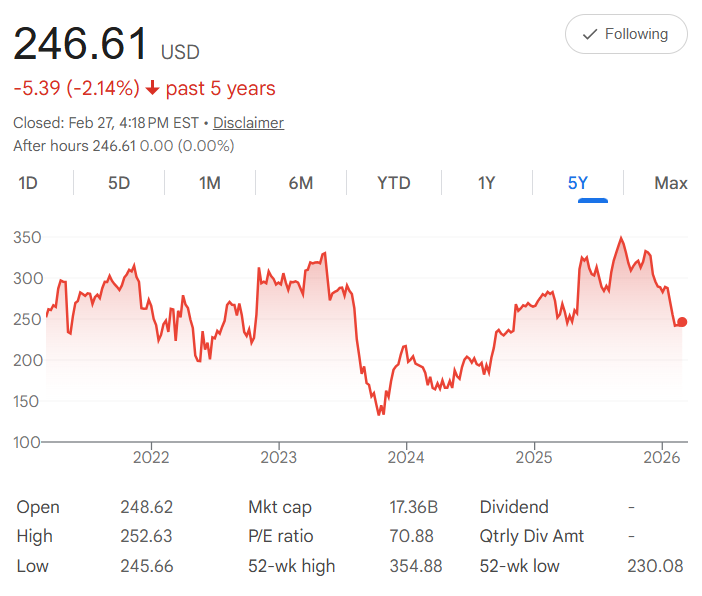 The 52-week high hit $354.88, which shows the stock has had periods of much stronger performance recently.