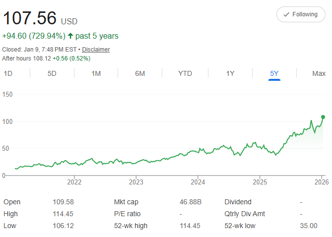 Five years ago, Cameco Corporation $CCJ shares were trading at much lower levels, but as today, the stock closed at $107.56—representing a massive 651.64% rise over the last five years, fueled by the global shift toward nuclear energy and a $46.8B market cap.