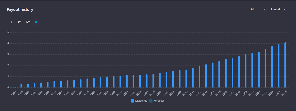 The mix of beverages and snacks smooths revenue across seasons and regions (see PepsiCo overview). In recent years, PepsiCo has leaned more into snacks—visible in the news—helping offset beverage ups and downs and keep margins healthy. PEP Dividends have risen for decades, and today the annual dividend run-rate is about $5.69 per share, paid quarterly, which works out to an approx. 3.98% yield at a share price around $142.95. On simple numbers, earnings per share over the last year are about $5.49, with about $8.49 expected over the next year. The stock trades at a price-to-earnings ratio of ~26 based on last year’s earnings (about ~17 on next year’s). The most recent quarter (ended September 30, 2025) was better than expected, with earnings beating by ~4.4% and revenue by ~1.9%. For a conservative portfolio, $PEP remains a model of stability, with dividends supported by a wide brand lineup and steady cash generation; investor relations: pepsico.com.