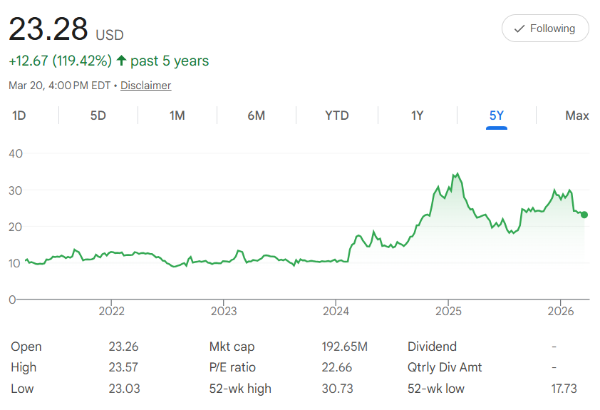 Picture this: Five years ago, Electromed $ELMD stock traded around $10.61 per share. Today, it closes at $23.28 — a strong +119% increase. The chart shows a gradual build with acceleration in recent years, supported by demand for respiratory and medical devices.