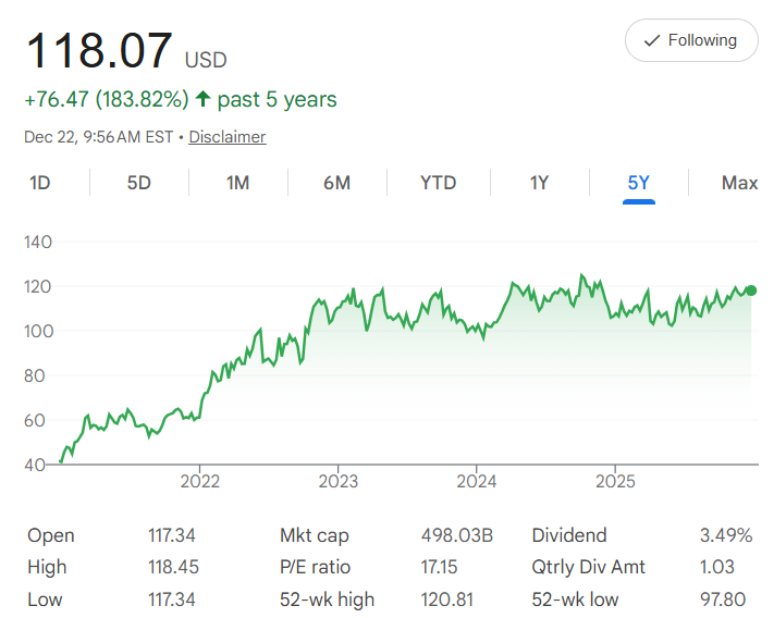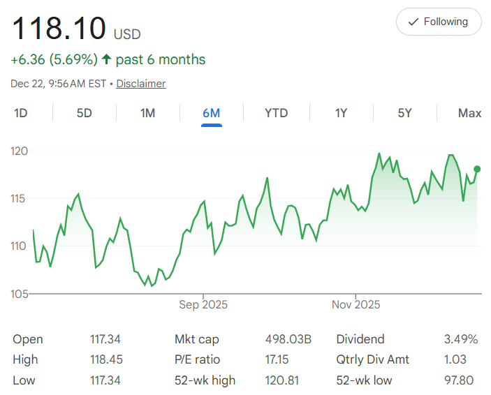 Five years ago, Exxon Mobil Corporation $XOM shares were around $66.65 each. As of today, it's at $116.69—a 75.09% gain from its core strength in oil exploration, refining, and chemicals, powering global energy needs. But let's zoom into the six-month chart for the real endurance test: Starting July near $115, it held steady through August highs around $118 on stable oil prices and production reports, then dipped in September-October to lows near $110 amid market volatility or energy sector shifts, before rebounding into December for a net 4.43% uptick. That mid-period pullback from $118 to $110 highlights typical short-term swings, but the overall climb shows resilience—with the 52-week high of $120.81 just touched and low at $97.80 far below, it's a reminder that brief drops are opportunities in a long-term uptrend.