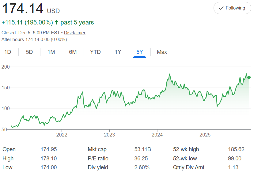 Five years ago, Valero Energy Corporation $VLO shares were trading around $59.11 each. Today, it's closed at $174.14—a strong 195% gain that reflects steady demand for refined fuels, chemicals, and renewable diesel amid energy transitions. The chart illustrates a reliable upward grind from 2022 lows, with solid progress through 2025, and a 52-week high of $185.62 pointing to more capacity ahead.