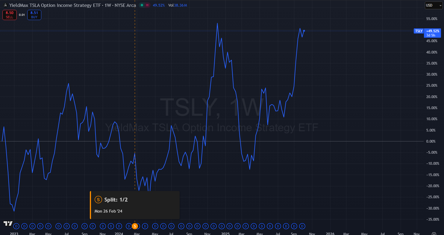 In February 2024, $TSLY executed a 1-for-2 reverse split, meaning every two shares became one while the price doubled.