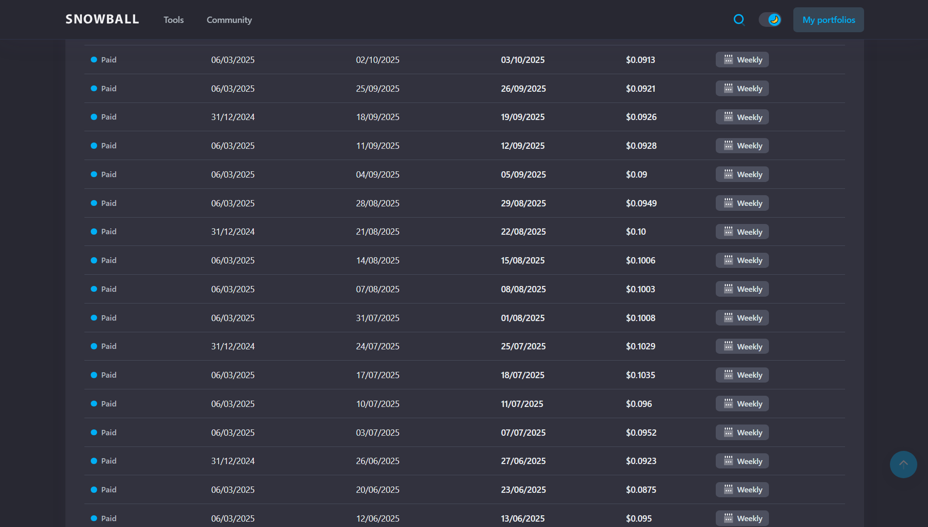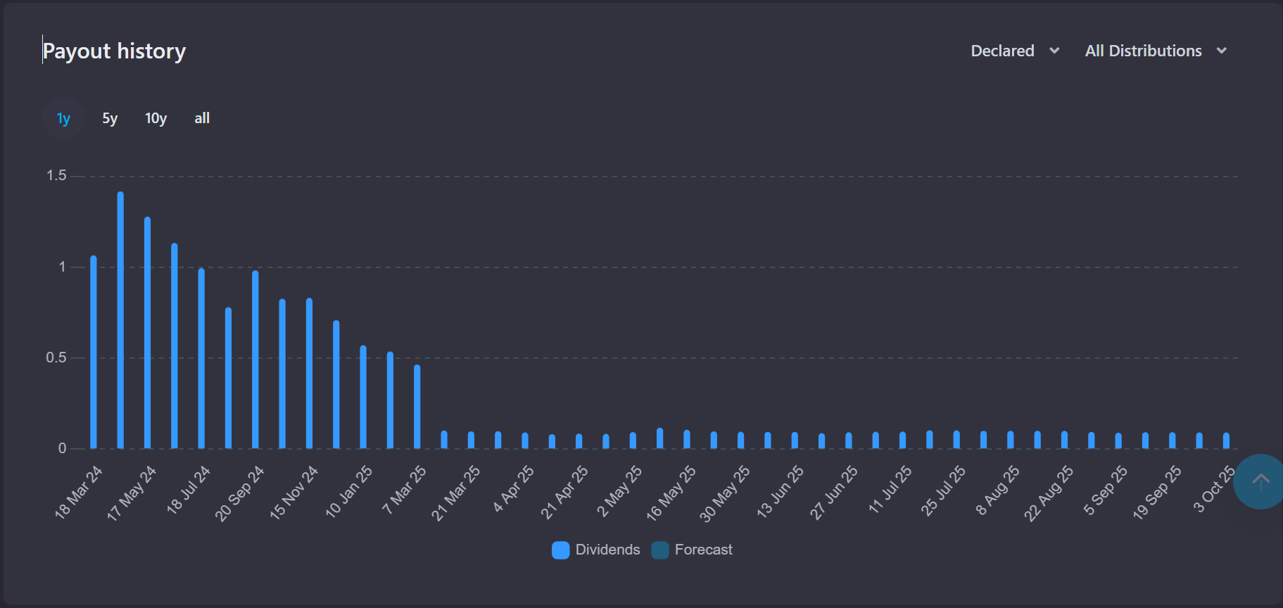 Snowball Analytics’ payout history shows $ULTY has maintained steady weekly dividends around $0.09 – $0.10 per share throughout 2025 with no sign of shrinking payments.