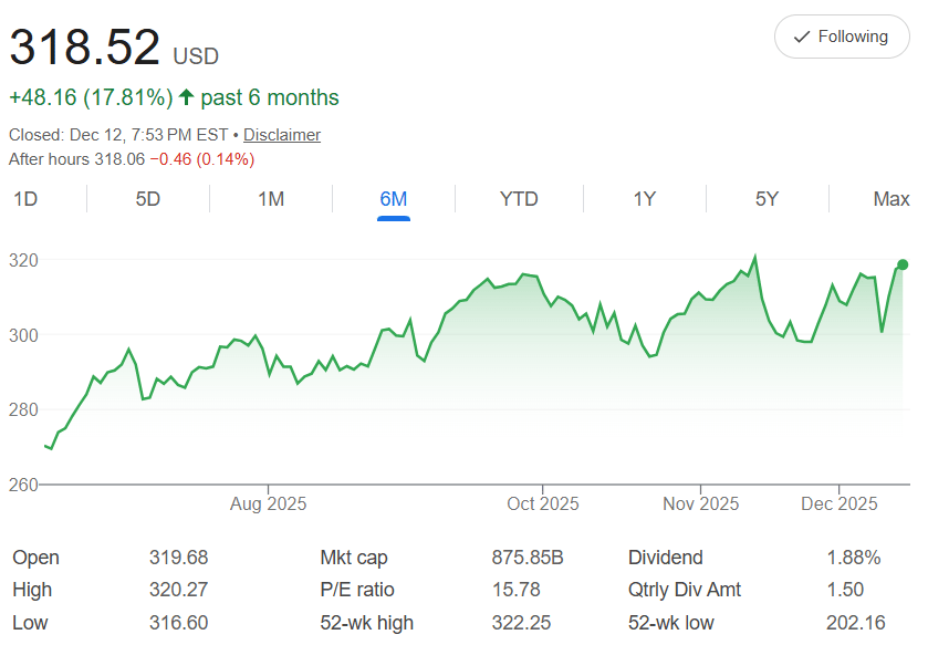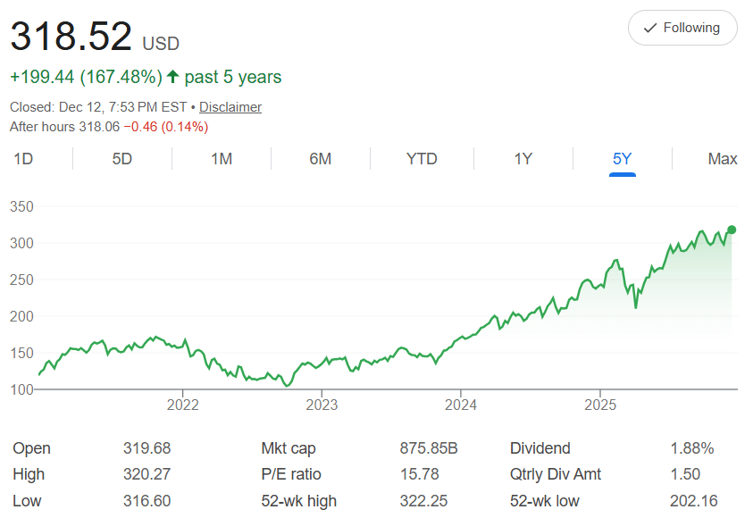Five years ago, JPMorgan Chase $JPM shares were around $119.08 each. As of today, it's at $318.52—a 167% climb from its role as a top bank handling loans, investments, and everyday finance for millions. Now, check the six-month chart for the real test: From August near $280, it rose to peaks around $320 in October on strong earnings and rate outlooks, then eased to November lows near $300 amid market worries or sector shifts, rebounding to today's close for a net 17.81% gain. After-hours at $318.06 shows the wiggle, but the uptrend holds—with the 52-week high of $322.25 just hit and low at $202.16 far behind, it's a reminder that short-term wobbles are part of the ride.