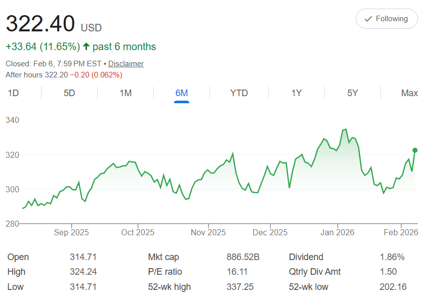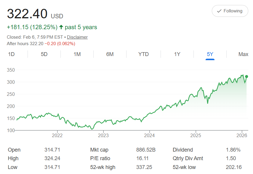 Five years ago, JPMorgan Chase $JPM shares were trading around $119 each. Today, it's closed at $322.40—a steady 171% increase that reflects its position as one of the world's strongest banks, earning reliably from consumer banking, investment banking, commercial lending, asset management, and market-making activities. The chart shows a clear long-term upward path from 2022 lows, with consistent gains through 2024–2026, and a 52-week high of $337.25 showing the stock is still near its strongest recent levels.