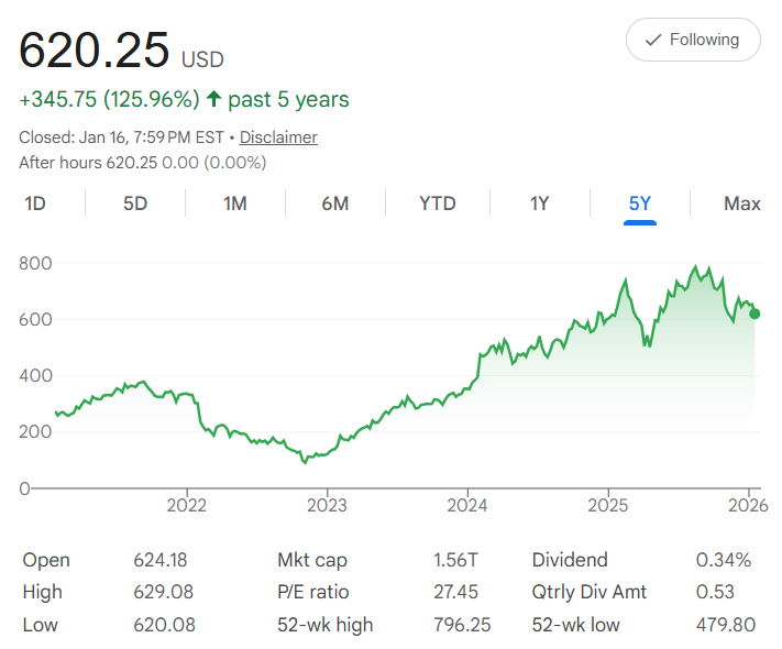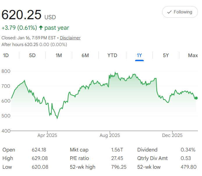 Five years ago, Meta Platforms Inc. $META shares were around $340 each. As of today, it's at $620.25—a 82.43% gain from its core in social media, ads, and ventures into VR, AI, and metaverse tech via Facebook, Instagram, and WhatsApp. The chart shows a firm base from 2022 lows, with steady expansion through 2025, and after-hours at $620.25. That 52-week high of $796.25 points to more connections ahead. In basic terms, the compound annual growth rate (CAGR) is 12.78%. That's the average yearly lift—calculated by raising the total growth factor to the 1/5 power and subtracting 1. It means growing your money by about 13% each year, on average. Dollar-cost averaging (DCA) keeps it linked: Invest $500 every month for five years, totaling $30,000.