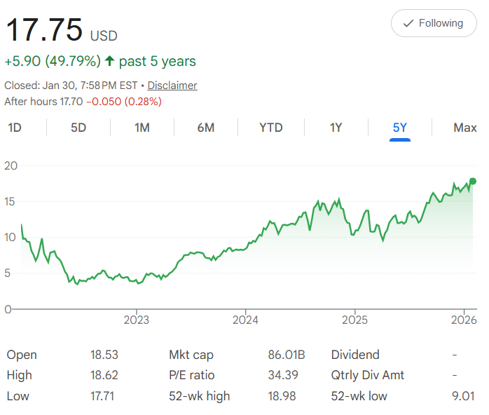 Five years ago, Nu Holdings $NU was just starting its public trading journey, with shares around $5–$6. Today, it's closed at $17.75—a very strong 206%+ rise that reflects its rapid expansion as Latin America's leading digital bank, offering accounts, credit cards, loans, investments, and insurance to millions of unbanked and underbanked customers in Brazil, Mexico, and Colombia. The chart shows a clear long-term upward trend: a base-building phase through 2023, followed by consistent gains in 2024–2025 as customer numbers and profitability improved. The 52-week high of $18.98 (reached recently) shows the stock is near its strongest levels in the past year.