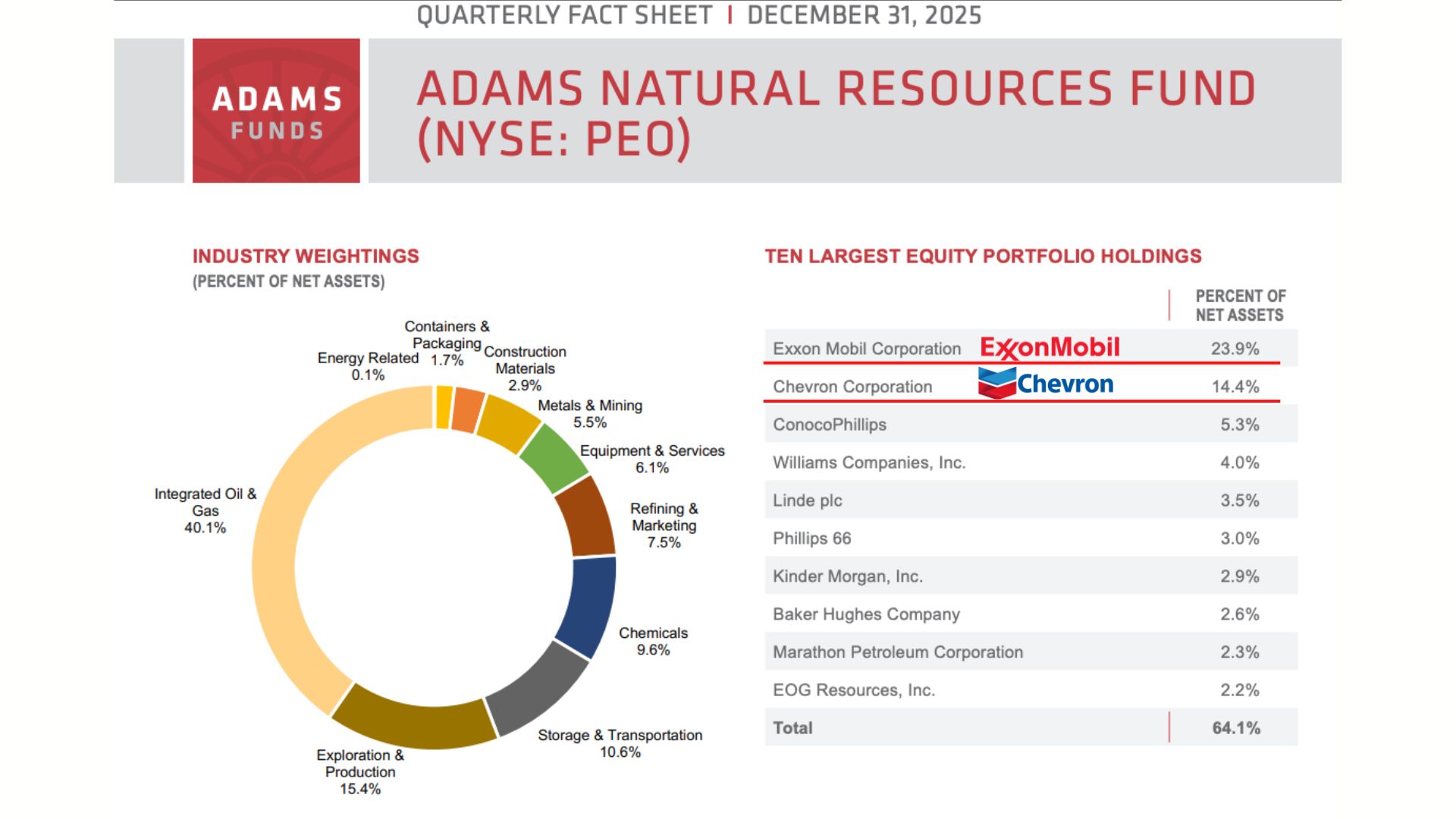 The top holdings are heavily concentrated in Exxon and Chevron, making up a significant portion of the portfolio. That concentration can be a strength or a risk, depending on your view of energy.