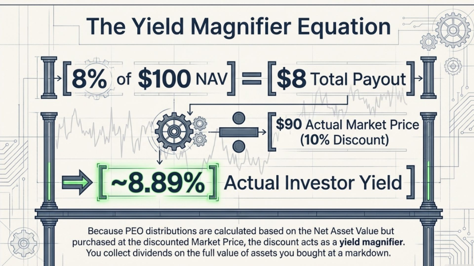 That creates an interesting effect. If the fund distributes 8% of NAV but you buy at a discount, your actual yield is higher.