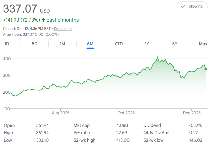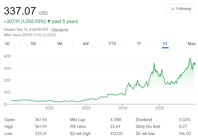 Five years ago, Powell Industries $POWL shares were around $30.70 each. Today, it's closed at $337.07—a massive 1,055% jump powered by booming demand for electrical switchgear, power control rooms, and infrastructure tied to data centers and energy projects. But zoom into the six-month chart for the real story: Starting August near $200, it climbed steadily to October peaks around $400 on strong orders and earnings beats, then pulled back through November-December to today's levels amid broader market rotations or profit-taking—for a net 72.73% gain despite the late dip. That pullback from $400 highs to $337 shows classic short-term volatility, but the overall uptrend holds firm, with the 52-week high of $413.00 already touched and low at $146.02 far in the rearview.
