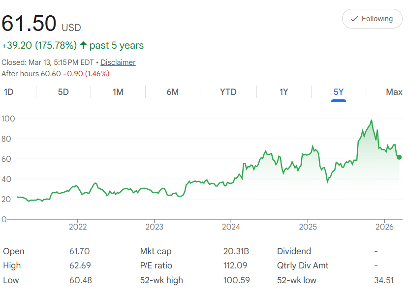 The 52-week high reached $100.59, nearly double the current price, showing the stock has already delivered big runs during strong demand periods.