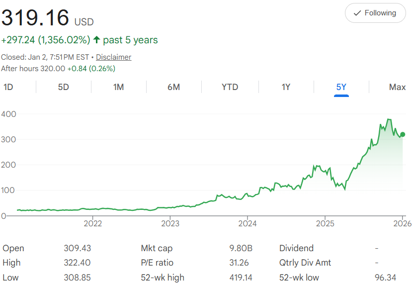 Five years ago, Sterling Infrastructure $STRL shares were trading around $21.20 each. Today, it's closed at $319.16—a remarkable 1,356% rise that comes from its strong work in heavy civil, residential, and specialty services, riding the wave of U.S. infrastructure spending and construction demand. The chart shows steady progress from 2022 lows, with real acceleration in 2024-2025, and after-hours at $320.00. That 52-week high of $419.14 stands as the recent top mark.