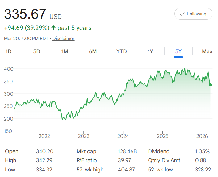 Picture this: Five years ago, Stryker $SYK stock traded near $241 per share. Today in March 2026, it closes at $335.67 — a steady +39% gain. The chart shows a clear recovery from earlier dips, with consistent upward movement in recent years tied to demand for orthopedic implants, surgical tools, and hospital equipment.