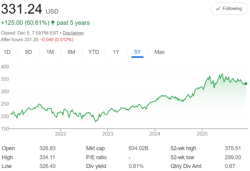 Five years ago, Visa Inc. $V shares were trading around $195.50 each. Today, it's closed at $331.24—a reliable 60.61% rise driven by its dominant position in global payments, with billions in transactions fueling steady revenue from fees and partnerships. The chart shows a consistent climb from 2022 lows, with measured gains through 2025 and after-hours at $331.20. That 52-week high of $375.51 highlights the potential for more volume ahead.