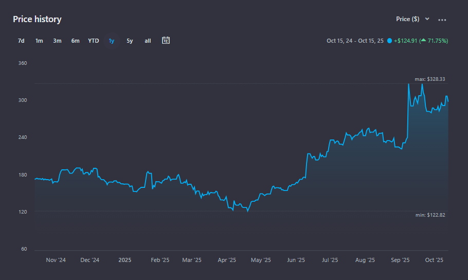Oracle (ORCL). Database software and cloud services (IaaS/PaaS/SaaS); revenue from subscriptions and cloud infrastructure. In Q1 fiscal 2026 revenue was $14.9B (+12% y/y); cloud revenue $7.2B (+28% y/y); remaining performance obligations $455B (+359% y/y). Over the past 12 months, the stock is up ~72%, with a high near $328.
