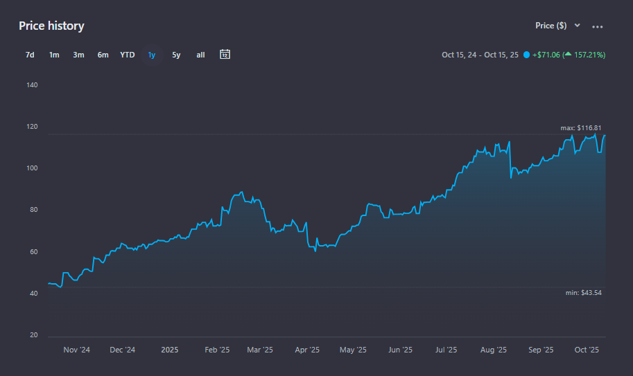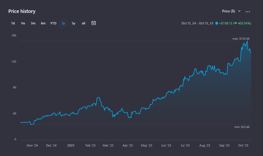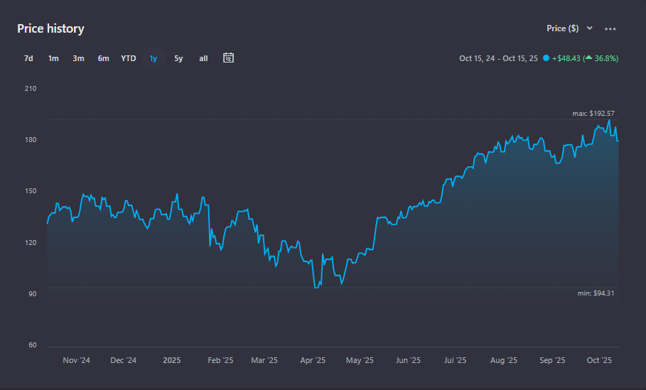 Palantir (PLTR). Data and AI software for enterprise and government; monetized via licenses and services. In Q2 2025, total revenue grew 48% y/y; U.S. commercial revenue was up 93% y/y. Management raised the full-year revenue growth target to ~45%. Over the past 12 months, the stock is up ~324%, with a high near $187. Investors.palantir.com