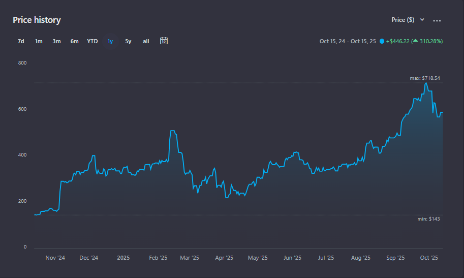 AppLovin (APP). Growth platform for mobile apps—ads, analytics, and monetization; revenue from subscriptions and fees. In Q2 2025, revenue was $1.259B (+77% y/y); net income $820M (+164% y/y); from continuing operations $772M (+156% y/y). Over the past 12 months, the stock rose ~310%, with a high near $719. Investors.applovin.com