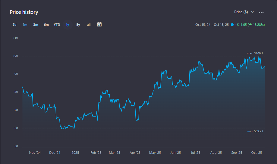 Uber (UBER). Platform for mobility and delivery; revenue from trip/order commissions plus ads and subscriptions. In Q2 2025, revenue $12.7B (+18% y/y); operating income $1.5B (+82% y/y); net income $1.4B. Over the past 12 months, the stock is up ~13%, with a high near $100. Investor.uber.com