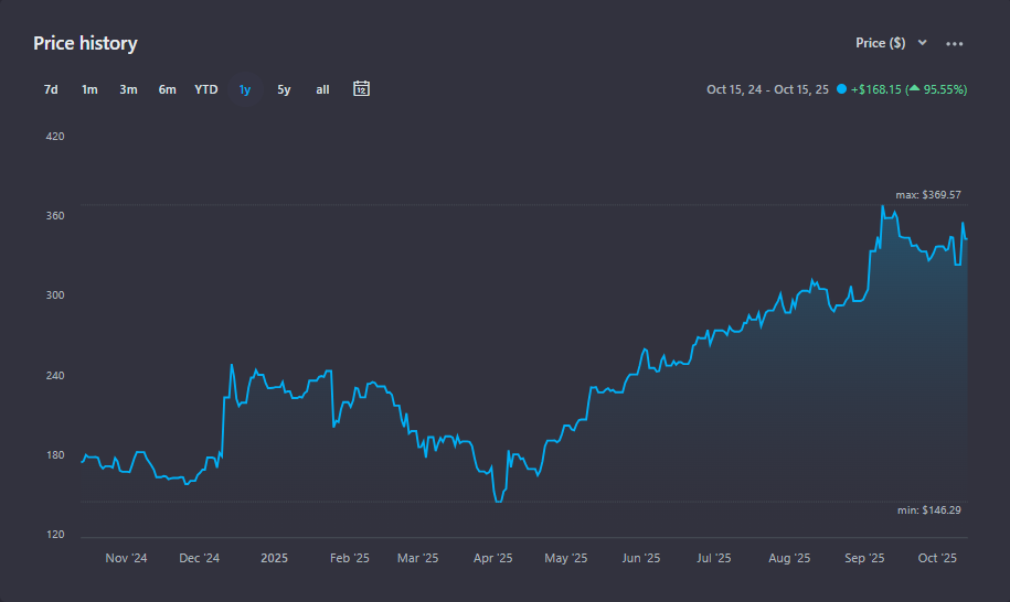 Broadcom (AVGO). Networking chips, custom ASICs, and infrastructure software; strong footprint in data centers. In Q3 2025, AI-related revenue rose 63% y/y to $5.2B; total quarterly revenue was about $15.95B. Over the past 12 months, the stock is up ~96%, with a high near $370. Investors.broadcom.com