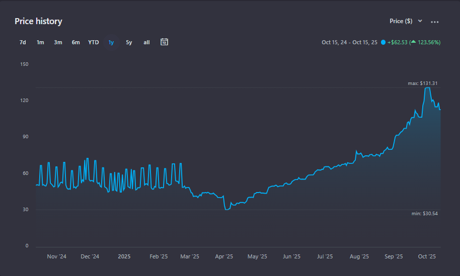 Western Digital (WDC). HDDs, SSDs, and storage solutions for data centers and PCs; core markets include cloud, consumer, and enterprise. Fiscal 2025 revenue was $9.52B (+51% y/y); Q4 revenue $2.61B (+30% y/y); quarterly free cash flow $675M. Over the past 12 months, the stock is up ~124%, with a high near $131. Investor.wdc.com