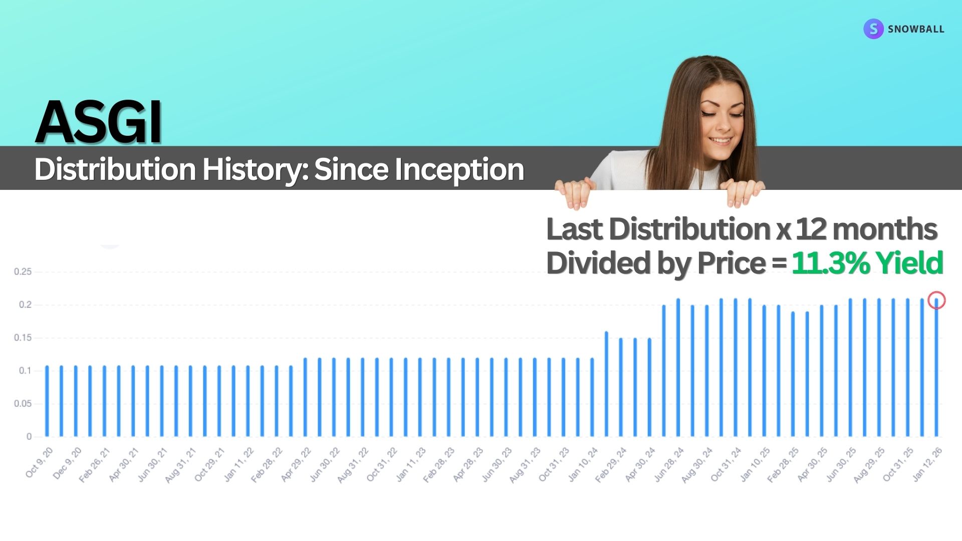 The key detail: ASGI distributes 12% of its NAV annually. When NAV dipped earlier this year, distributions dipped slightly too before moving back up. It’s an aggressive policy. It works well in rising markets, but in a prolonged downturn it could pressure NAV.