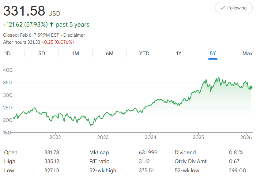 Five years ago, Visa Inc. $V shares were trading around $200 each. Today, it's closed at $331.58—a reliable 66% rise that comes from its position as the world's leading payment network, quietly handling trillions of dollars in card transactions every year across virtually every country. The chart shows a calm, consistent upward trend from 2022 lows, with measured but persistent gains through 2025 and early 2026, and a 52-week high of $375.51 proving the stock still has room to move higher.