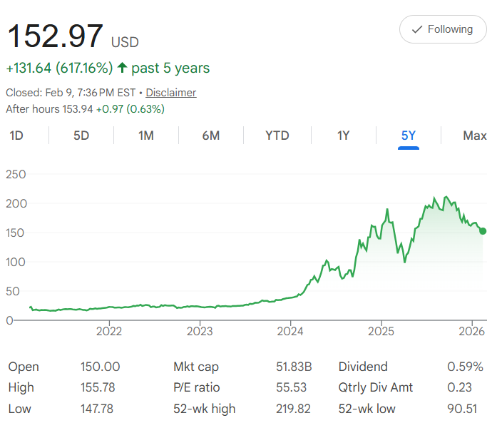 Five years ago, Vistra Corp. $VST shares were trading around $22–$23 each. Today, it's closed at $152.97—a very strong 617% gain that comes from the massive increase in electricity demand (especially from data centers and AI), favorable power prices, and the company’s large fleet of natural gas, nuclear, coal, solar, and battery storage assets across key U.S. markets. The chart shows a long, quiet base period through 2023, followed by an explosive move higher starting in 2024 and continuing strongly into 2026. The 52-week high of $219.82 (reached earlier in the run) proves how far the stock has already climbed.