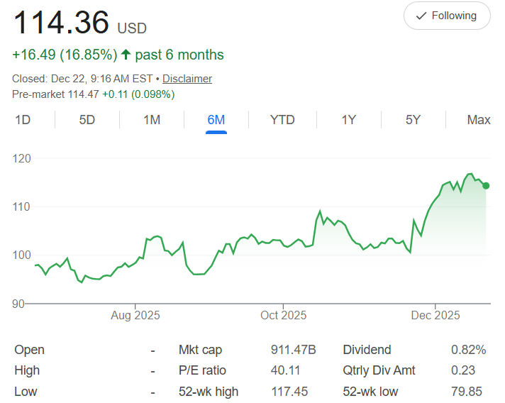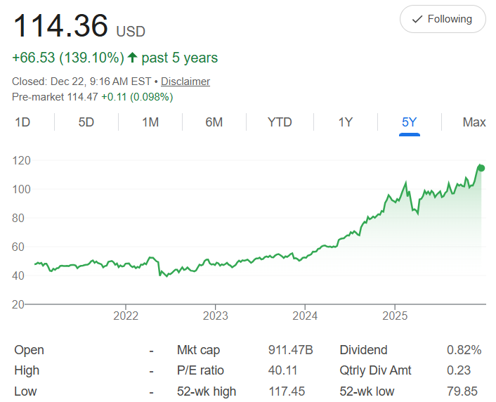 Walmart's journey $WMT is a classic tale of retail dominance, evolving from brick-and-mortar giant to a powerhouse in e-commerce and omnichannel shopping. From five years ago at $47.83 a share to today's $114.36, the 139% gain reflects its ability to capture everyday spending—groceries, household items, and online orders—while fending off competitors through low prices, vast supply chains, and investments in tech like pickup, delivery, and Walmart+. The chart's steady upward slope, with a strong push in 2025, underscores this reliability, with after-hours at $114.38 and a 52-week high of $117.45 showing the momentum is fresh.